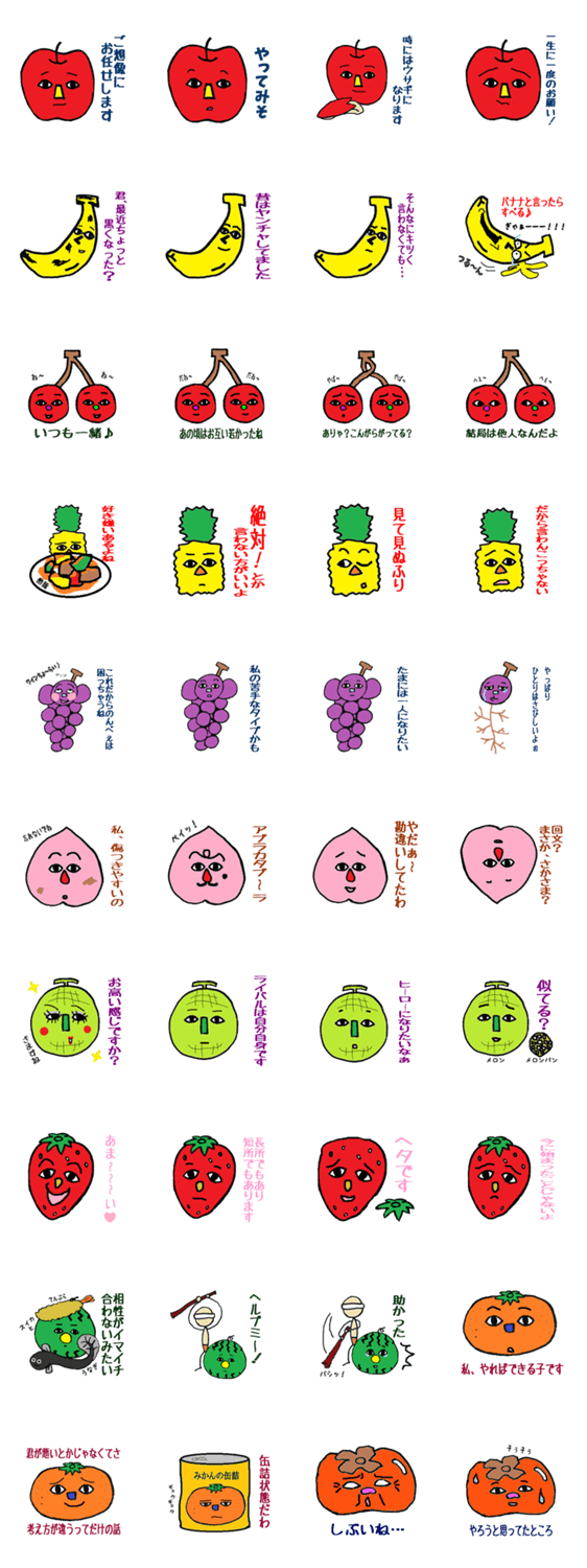 果物たちが思ったことをさりげなく言います。シュールで面白いスタンプです。