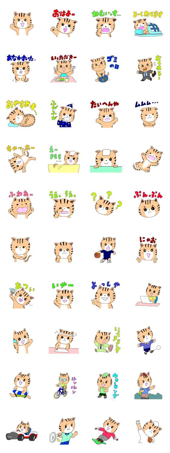 元気な子ねこのにゃんたろうのスタンプです。勉強やスポーツ、普段の生活の一コマを切り出してみました。なんでもがんばる! でも、ねむたい時もあるにゃあ。