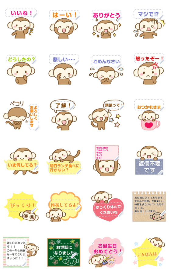 ゆるくて可愛い猿のスタンプです。スタンプ画像に最大100文字まで自由にテキストを入力できます。表情豊かで日常会話に使いやすい、ほんわか可愛いおサルのスタンプです♪