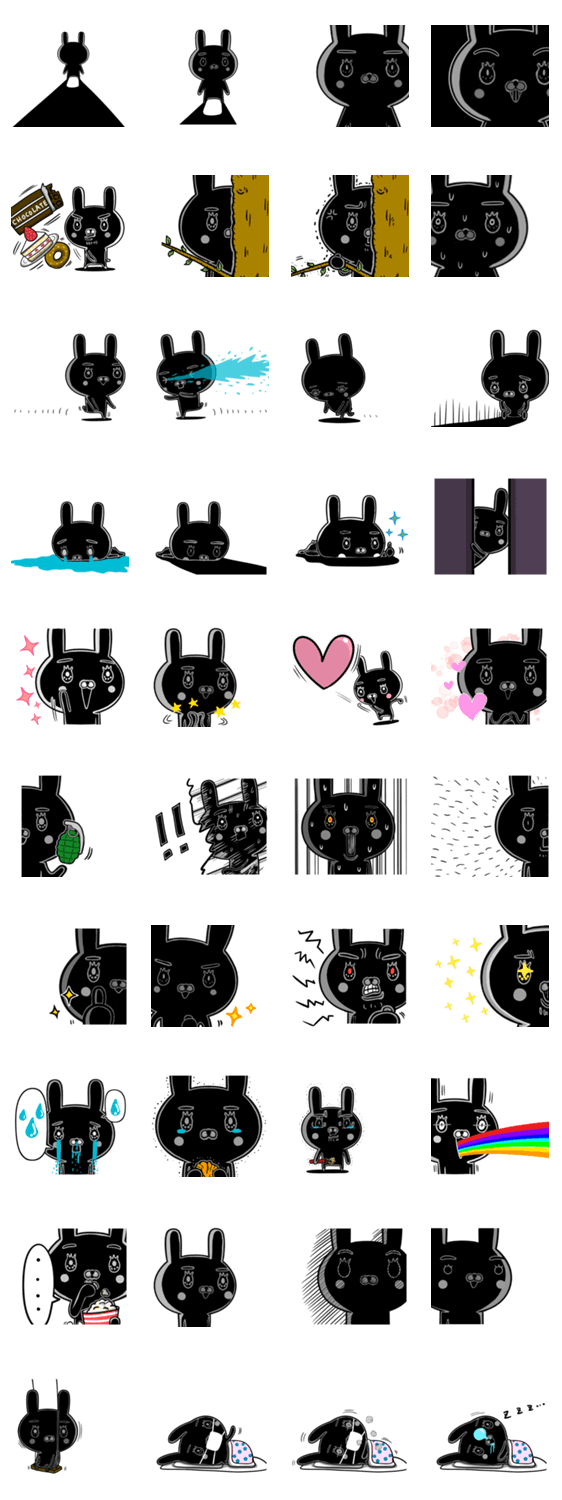 太い眉毛の.黒いうさぎ.兎さん.ラビット.が可愛く動きます。泣く.笑う.おこる.驚く.投げる.焦る.逃げる.追いかける.了解する.拍手する.すねる.反省する.恋する.寝る.折る♡
