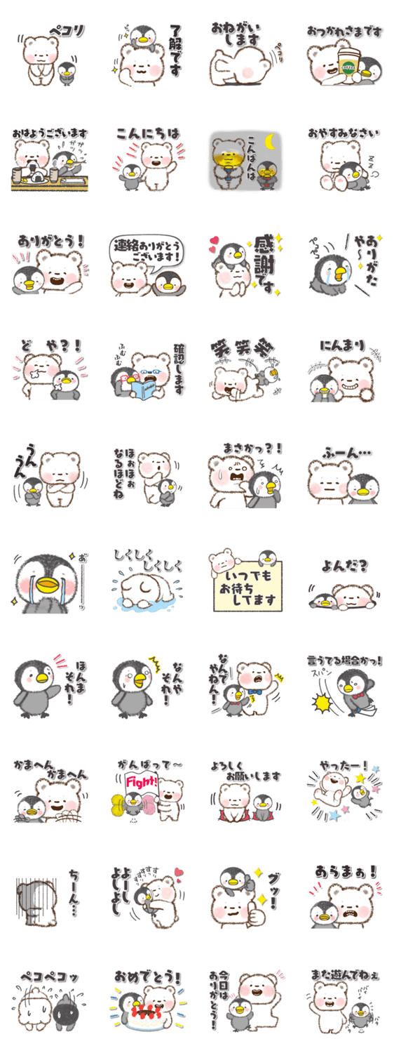 関西弁も話せるふわふわもふもふのクマさんとペンギンちゃんの、使いやすいスタンプ です。