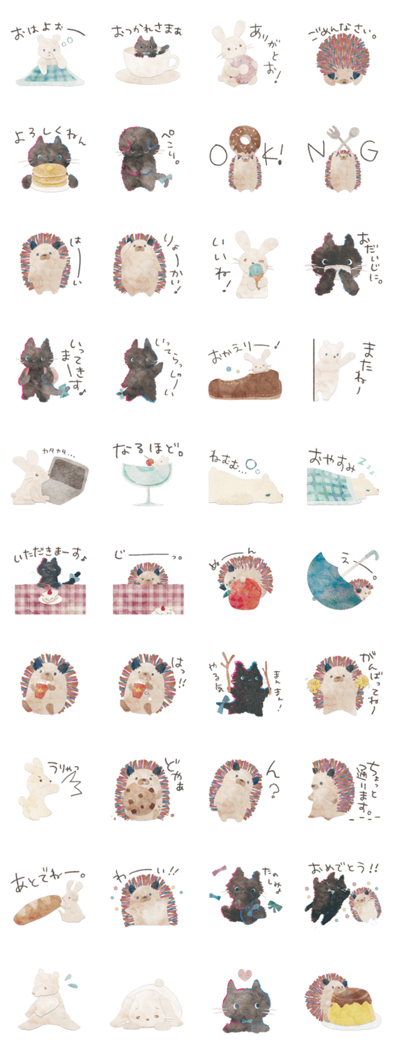 絵本の中に住むはりねずこ、黒ネコくっぴーたちのスタンプ。おやつのじかんだよ!