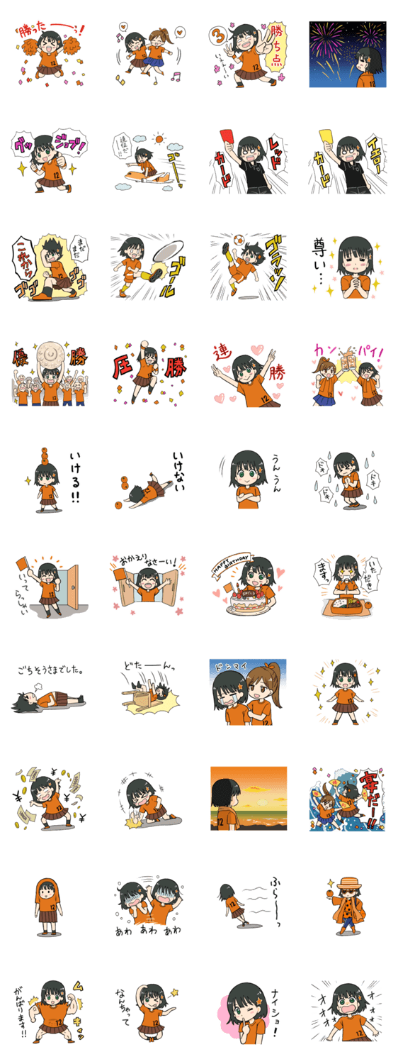 オレンジ色のサッカーチームを応援する女子サポーター松原ミホのスタンプ第2弾です。今回は喜びのスタンプ多めです!