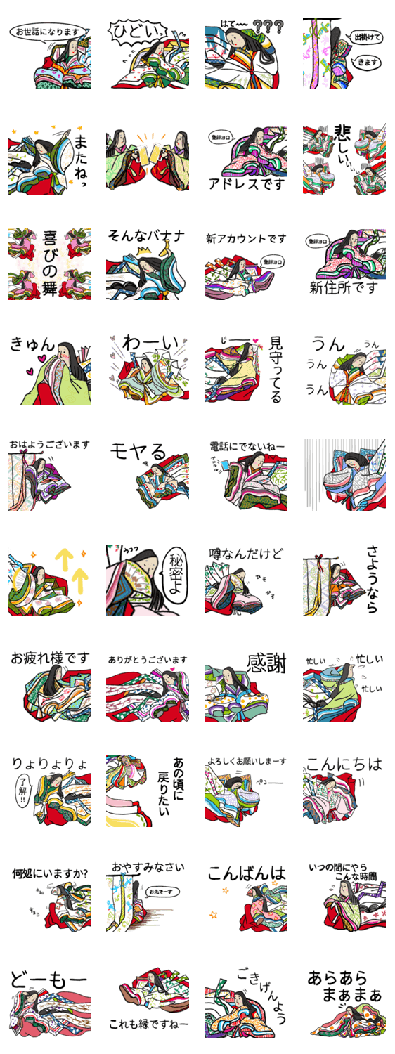 背景に依存する優雅な古風女子スタンプ。新生活や日常会話にに使えます。背景に応じて服に色が変わります。