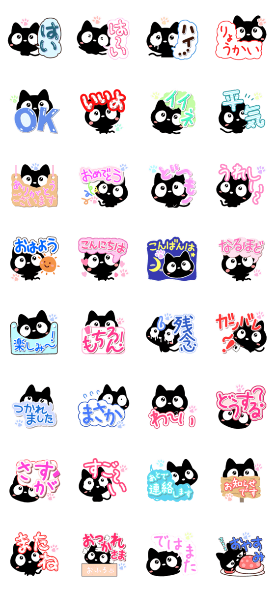 『クロネコすたんぷ』から『基本編』です。かわいい黒猫さんが、カラフルな文字で返信します。日常でよく使う基本的な言葉を集めました。ねこ好きな方にぜひ。【かたこ】