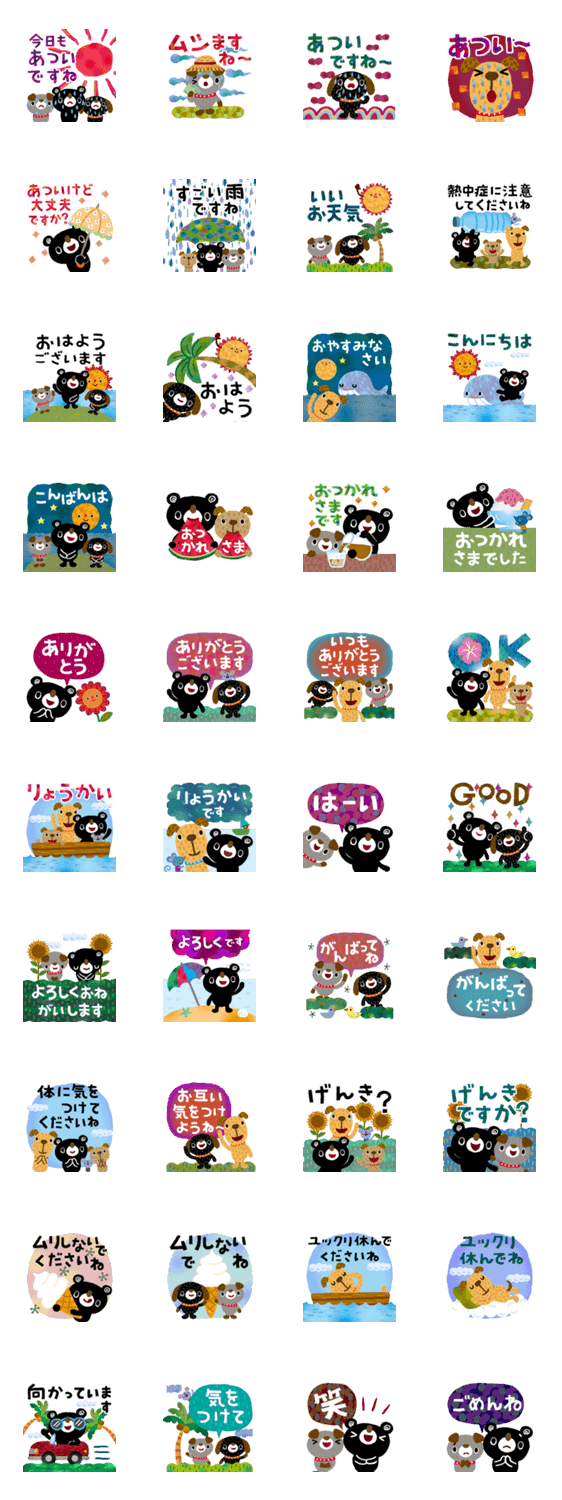 絵本みたいなどうぶつたちの夏スタンプです。 使いやすい言葉を夏バージョンで♪ カラフルなスタンプで暑い夏を乗り切ろう!