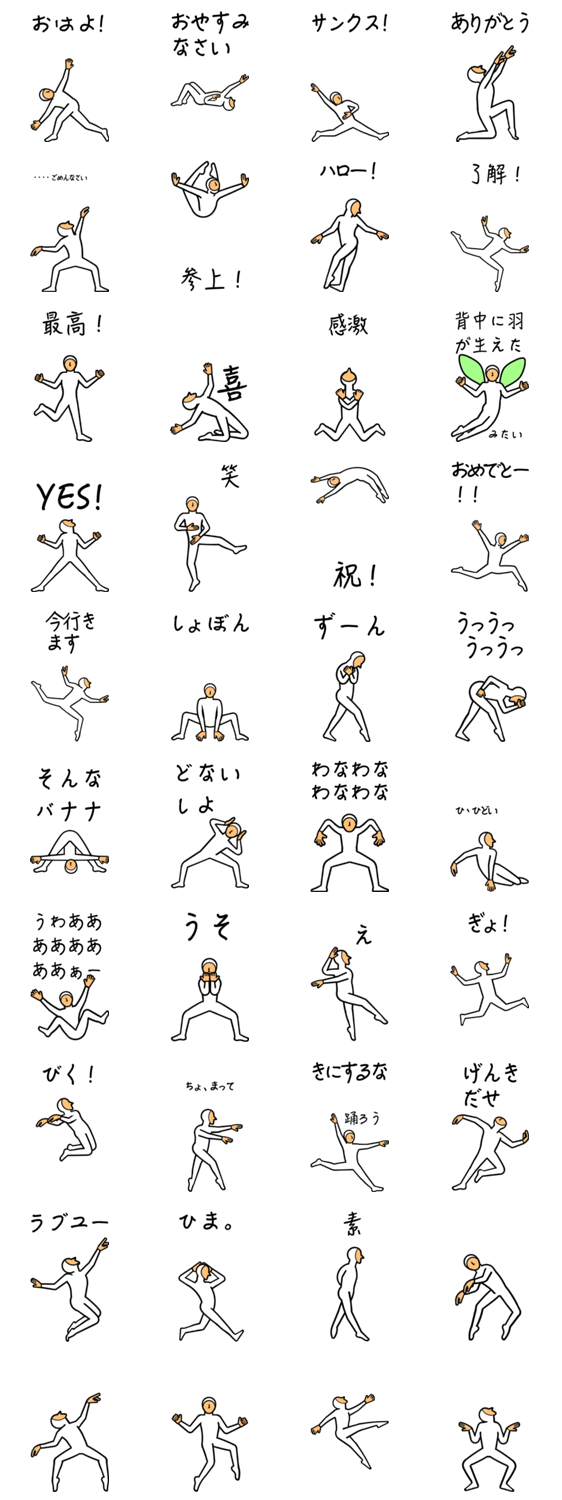 人気のニンゲンマンのビックサイズです。日常会話、あいさつ、リアクション、男性キャラ、友達、カジュアル、励まし、恋人、モダンダンス、ダンス、ダンサー、バレリーナ ※このスタンプはトークルームで大きく表示されるBIGスタンプです。