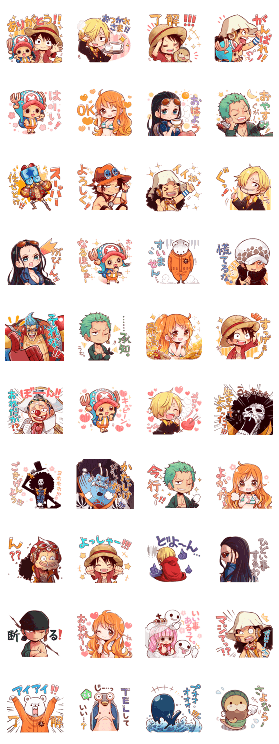 ONE PIECEの毎日使えるスタンプです。ルフィ、ゾロ、サンジ、ナミ、ウソップ、チョッパー等…毎日使えるリアクションや挨拶が沢山はいっています。一年の限定配信です♪