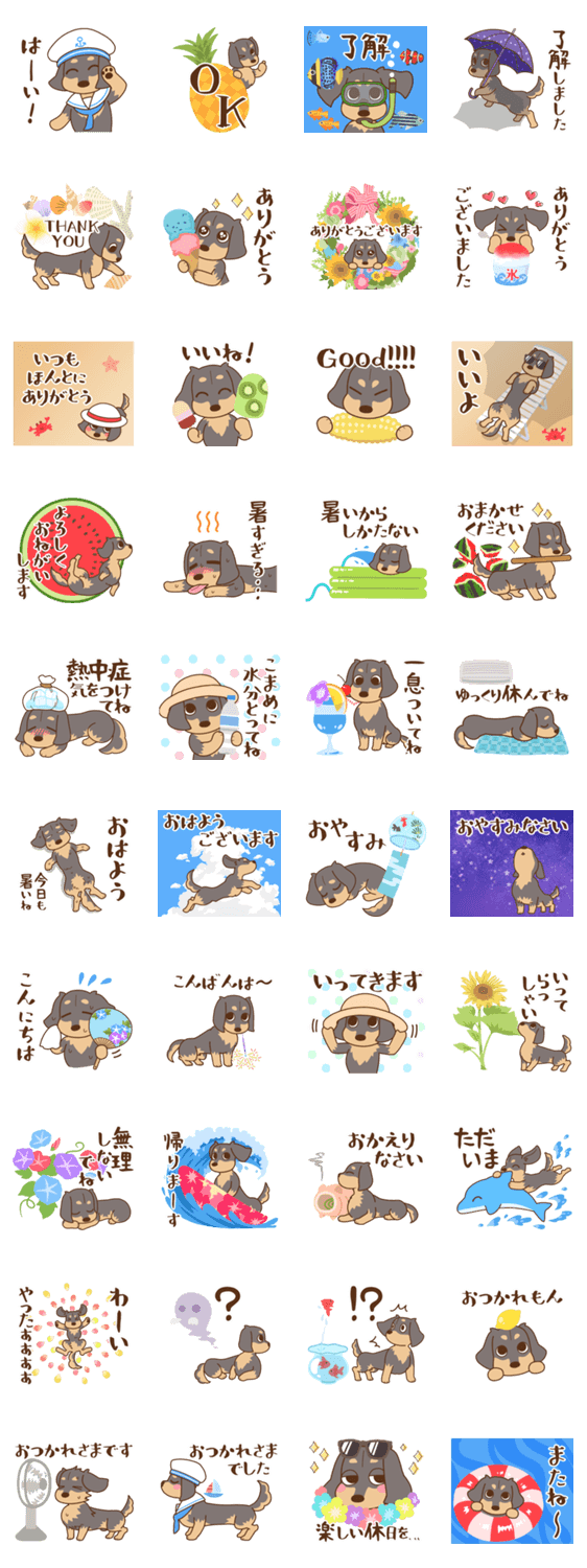 ダックスフンドのほんわか可愛いスタンプです。夏に使いたくなる季節感のあるイラストとよく使う言葉を厳選していて便利です。