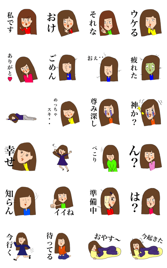 パッツンロングの個性的な女の子、miccaちゃんの日常で使えるスタンプです。