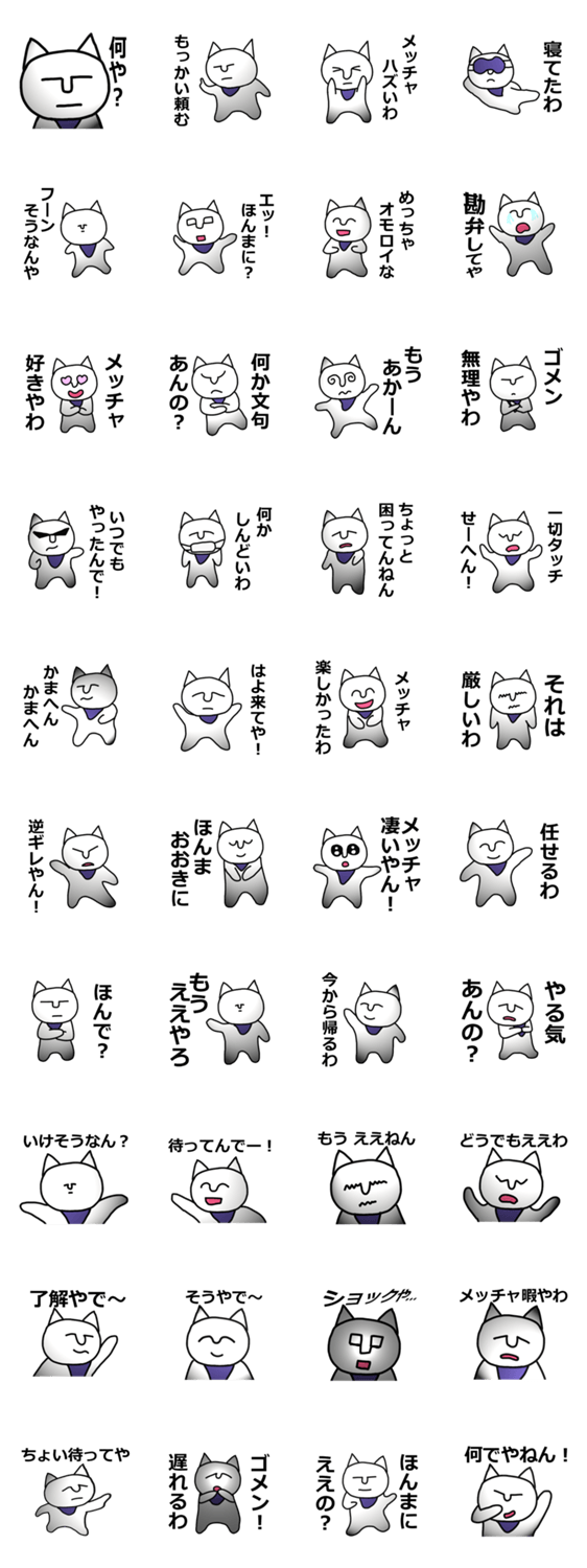 大阪弁で喋るネコっぽい可愛い奴です。上から目線で生意気でウザイですが、同僚や仲間、友達との日常会話やグループ会話、返信に使えると思います。