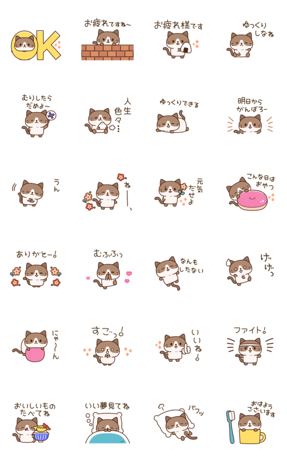 ほんわかと優しいネコさんが気づかったり優しい言葉をかけたりします。家族や友達など声をかけたいときに使えます♪