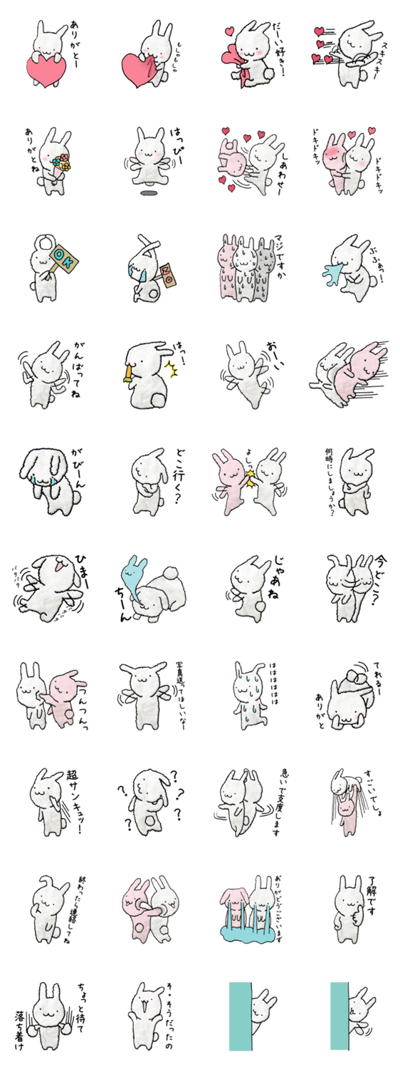 たくさんのラブラブ好きスキと便利相づちがいっぱいです。ふわふわもふもふもこもこタッチなうさぎさん達をお試しあれ。
