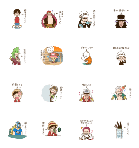 それなりに気持ちが伝わるスタンプです。 登場キャラ:ルフィ,ゾロ,チョッパー,ウソップ,ロー,ベポ,キッド,キラー,カタクリ,バルトロメオ,スモーカー,ルッチ,赤犬