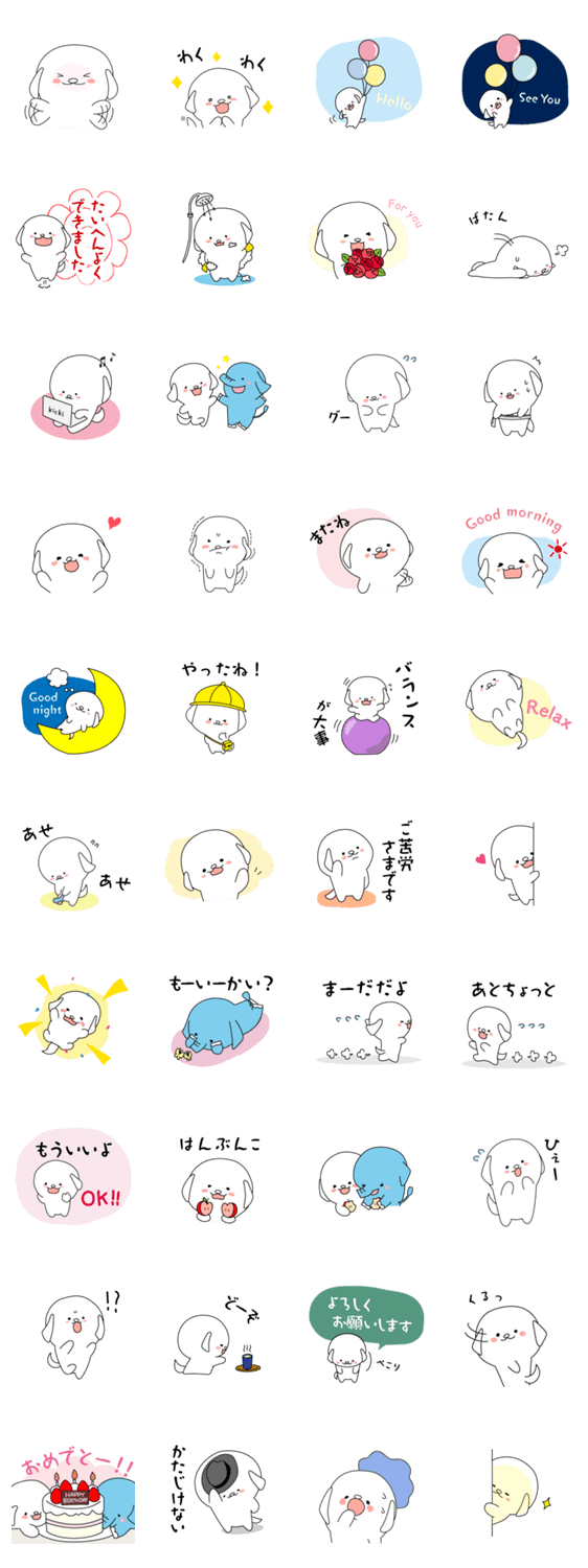 シリーズ第2段。かわいい白い犬のキッキ。挨拶やお祝いの言葉が加わった、ほんわかするスタンプです。