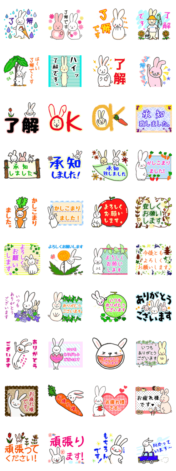 仕事や連絡網などでよく使う「了解です」「よろしくお願いします」「お疲れ様です」の敬語スタンプをウサギのイラストを使用して作りました。落ち着いたデザインも有り。