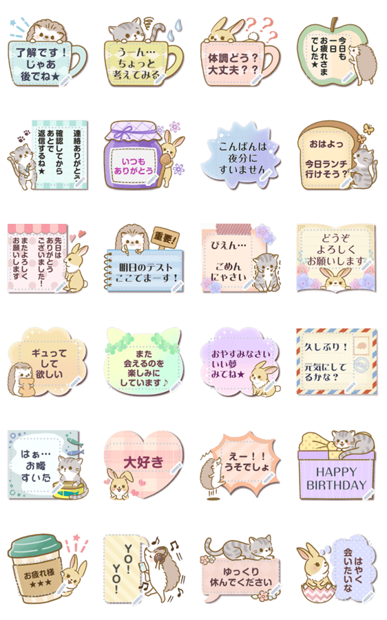 落ち着いた色合いのメモ帳や吹き出しデザインがいっぱい。自由に文字を入れてオリジナルのスタンプを作ろう!ハリネズミ、ねこ、うさぎなど、キュートな動物をそえて♪ 現在この商品は一部のスマートフォン版LINE 10.3.0以上のトークルームでのみ使用できます。動作環境の最新情報はヘルプをご確認ください。
