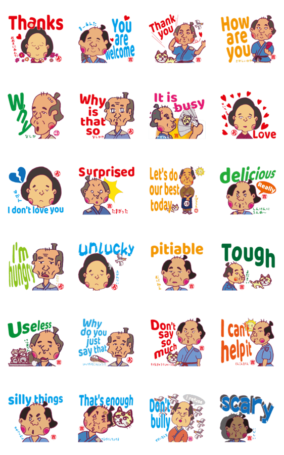 「吉四六さんのおはなし」(大分弁→英語)バージョンのスタンプです! トンチで有名な吉四六さん。 普段使いできる(大分弁→英語)のスタンプをお楽しみください!!