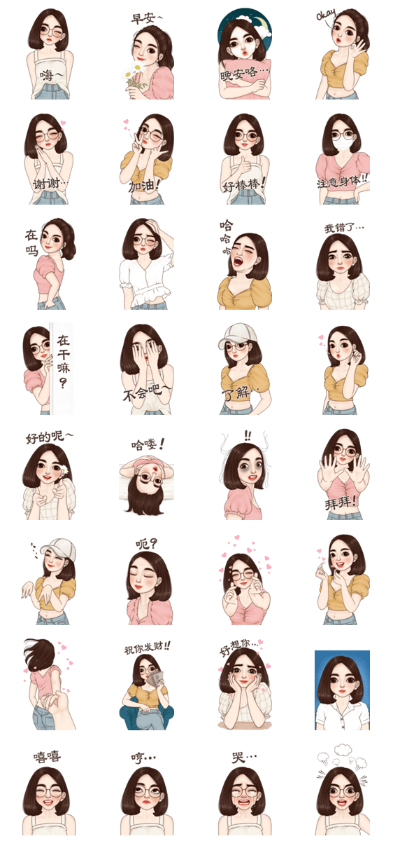 Hello!!! cute girl, short hair girl, glasses girl, sexy girl These stickers will show up extra large in chats.