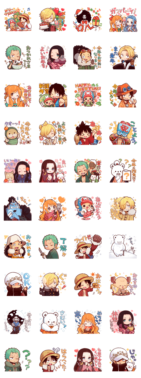 ワンピースの冬に毎日使えるスタンプです。ルフィ、ゾロ、サンジ、ナミ、チョッパー、エース、ロー、ベポ等…クリスマスや大晦日、お正月に使える挨拶等が沢山入っています