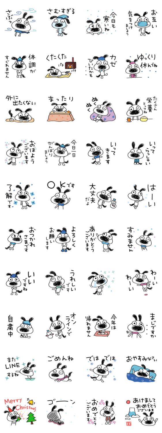 犬のバウピー。冬に使える編。「さむすぎる」から「ぬくぬく」まで。クリスマス、年末年始、お正月。冬の季節にピッタリの表現がいっぱい。家族、学校、お仕事でも。
