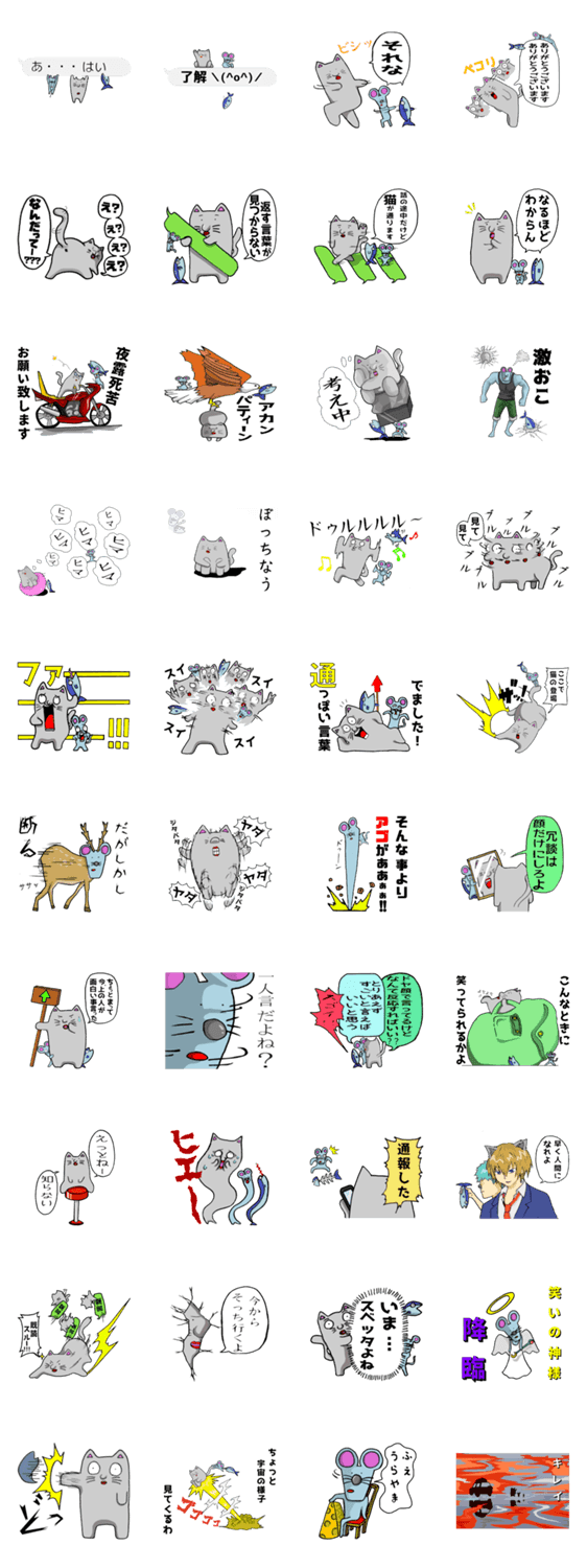 灰色猫スタンプシリーズ第2弾です!キモカワでシュールな猫のキャラクターにネズミと魚の友達が加わりました!煽りあり!笑いあり!癒しあり!のスタンプとなっています。