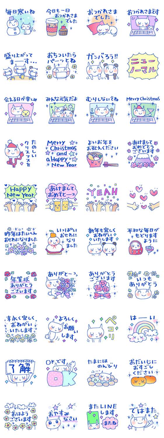 クリスマスや年末年始に明るい気持ち伝わるやさしい色の40個。新年のご挨拶(年賀状)リモートやマスク会食、うさきゅんの新しい冬の文字くっきり見やすいスタンプです。