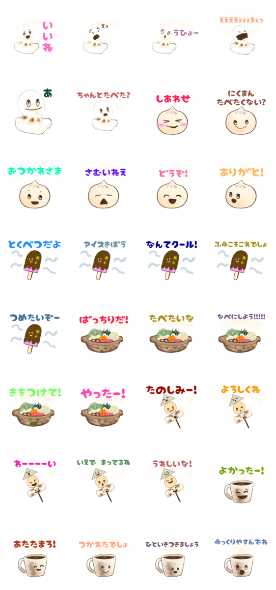 もち、なべ、アイス、肉まん、コーヒー、串おでんなど。冬においしい食べものでスタンプつくりました。あいさつや食べたい主張にも使います。