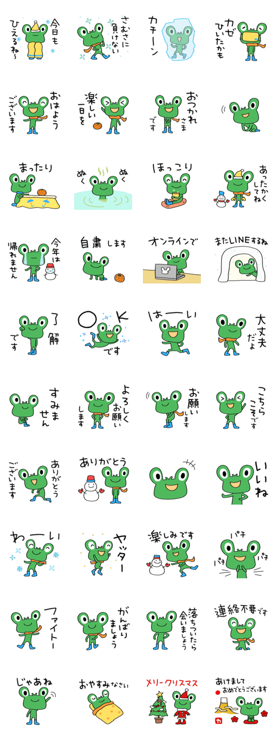 カエルのカエルん。冬編。「今日もひえるね〜」「今年は帰れません」から「オンラインで」まで。クリスマス、年末年始、お正月。家族、学校、お仕事でも。