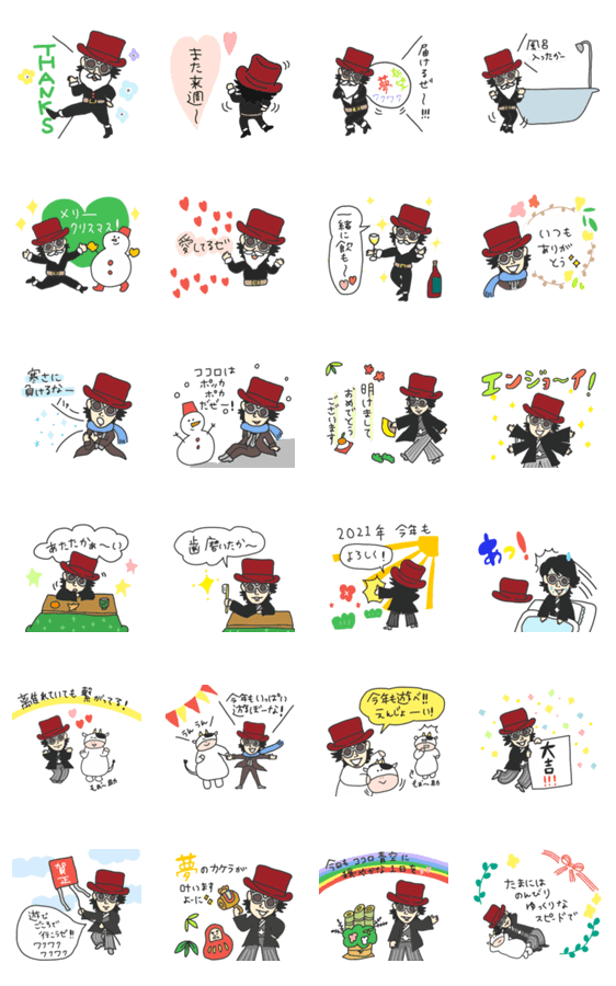 チャーリーmoritomoとPOCAのお絵描きコラボスタンプ第二弾。 今回はウシのもぉ〜助も一緒に登場するよ。クリスマス、お正月、年明け、年末年始に使いやすいスタンプ♡