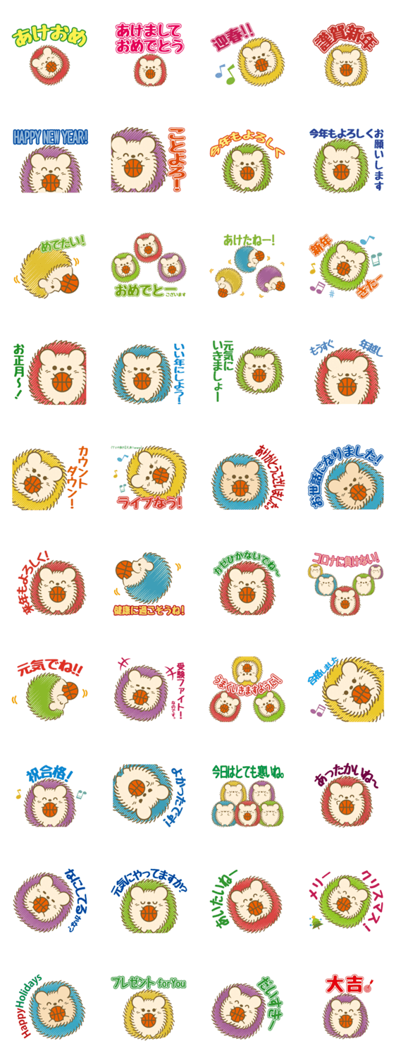 年末年始、新年のご挨拶、クリスマス、受験シーズン、冬の挨拶などに使える大きな文字のスタンプ。カラフルなハリネズミがカワイイです♪