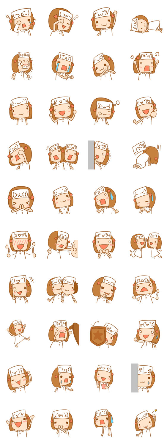 おでこに顔文字をくっつけた女の子です。いろんなシチュエーションに合わせて喜怒哀楽を可愛く表現します。