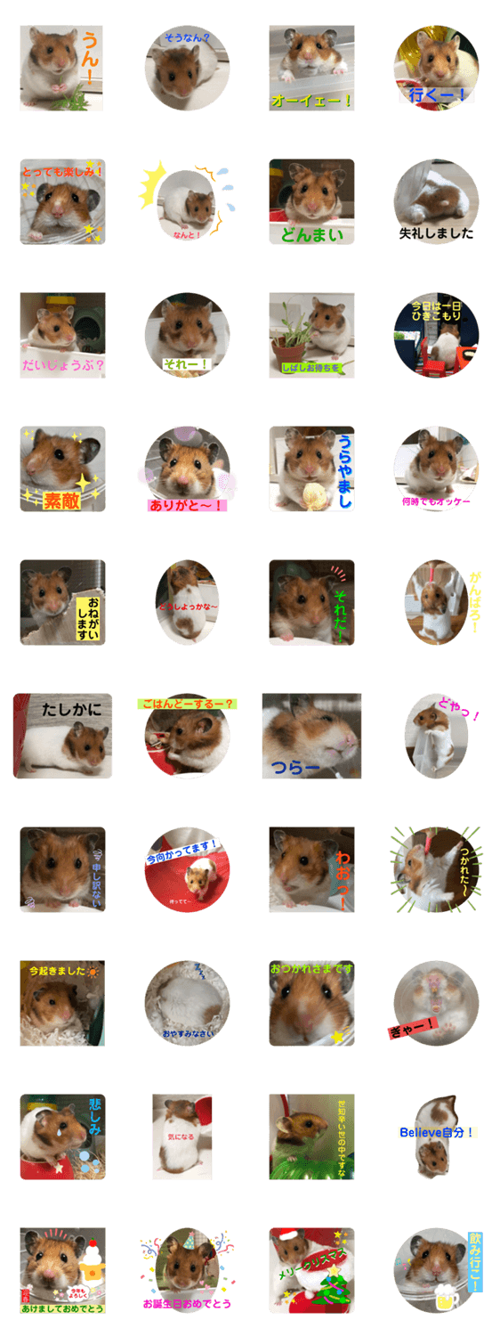 ゴールデンハムスターぱぴさんのスタンプです。日常会話や普段の挨拶に加えてお正月・クリスマス・お誕生日のスタンプも!