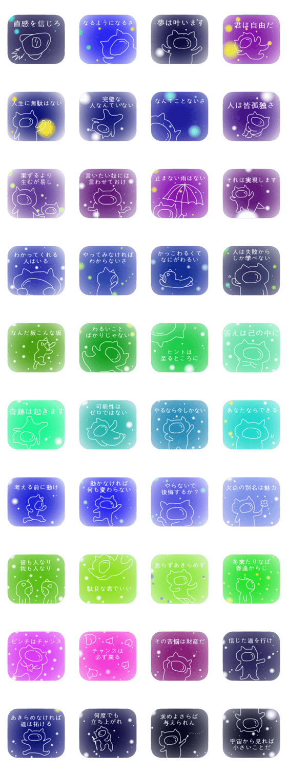 恋愛、仕事、人間関係、現代の迷える子羊だちよ。宇宙の声を聴きたもれ。励ましたい時、背中を押したい時に送りたい、前向きなポジティブメッセージスタンプ。