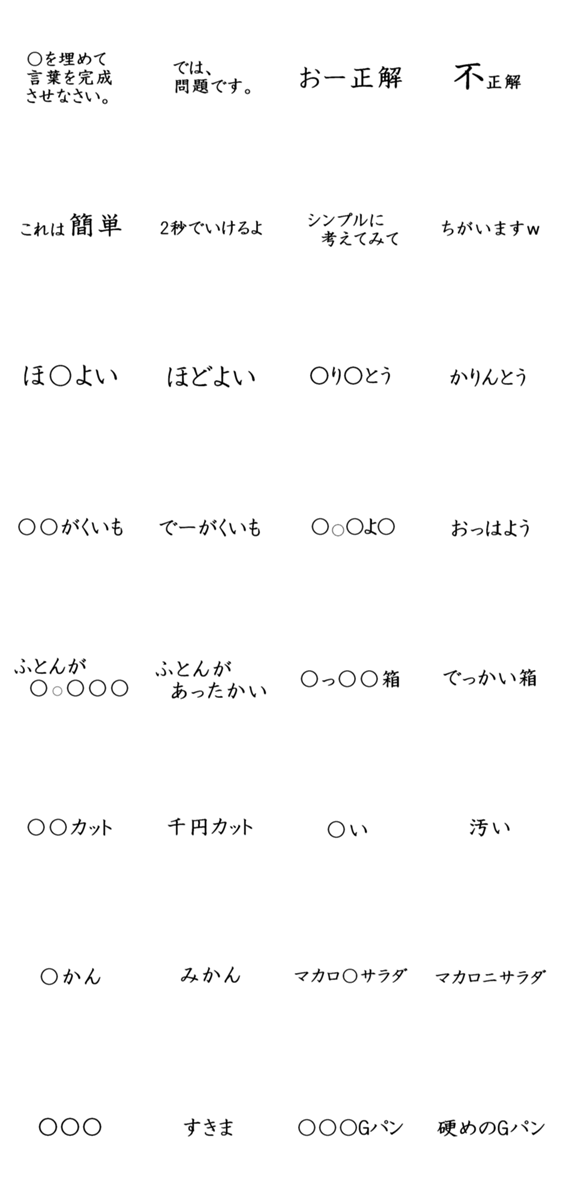 チャットで楽しめる激ムズ穴埋めクイズです。誰も解けません。途中ふつうの問題も入れといたのでたまに使って混乱させましょう。