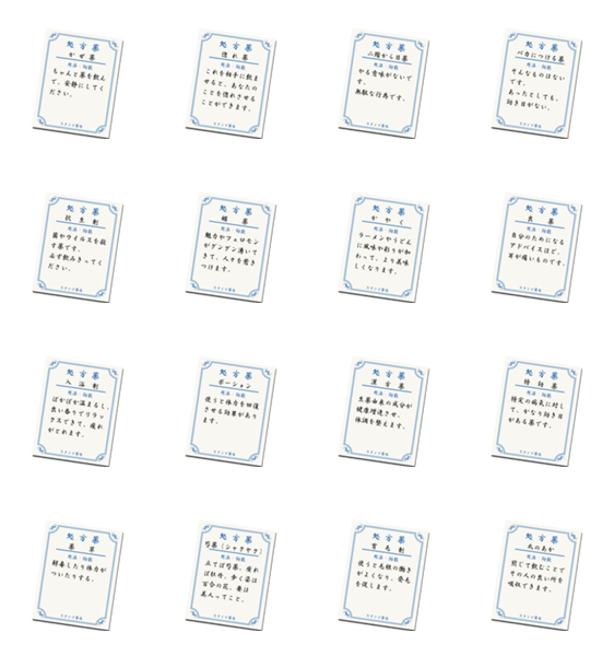 薬袋に文章を添えました。日本のことわざやたとえを盛り込んでいます。