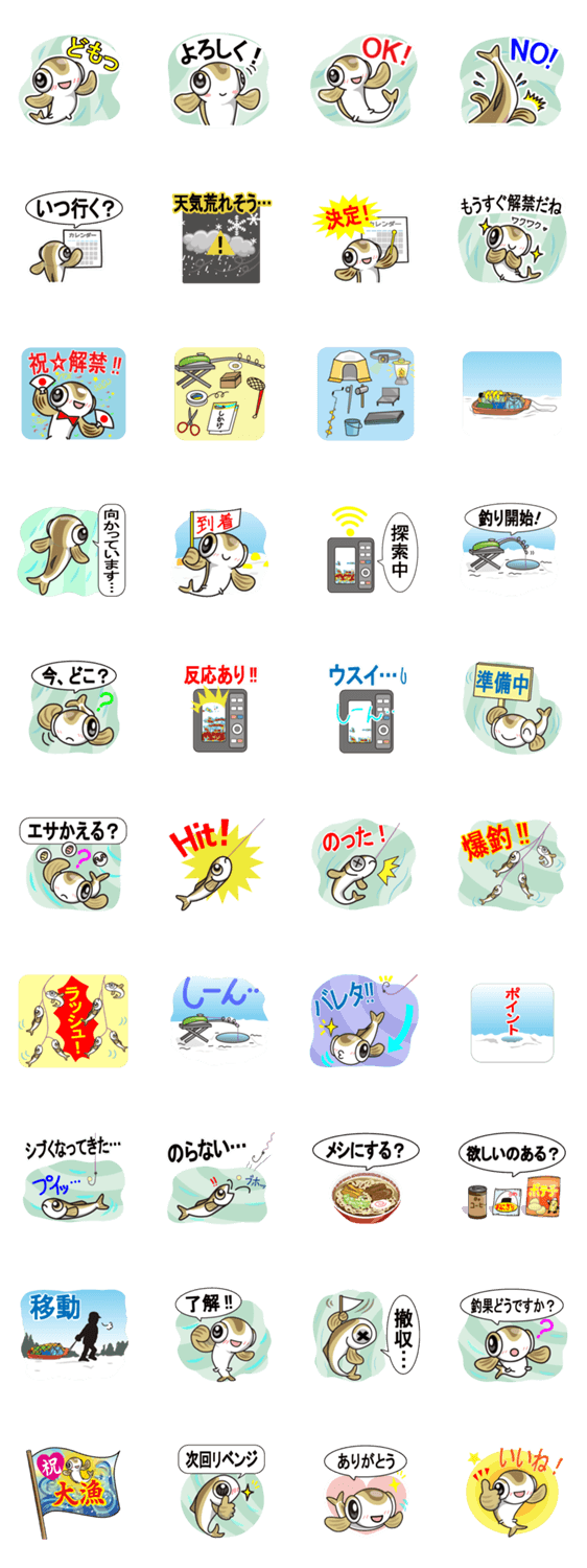 ワカサギ氷上釣りで連絡しやすくなるスタンプです。文字が大きく、ワンクリックで気持ちが伝わります。