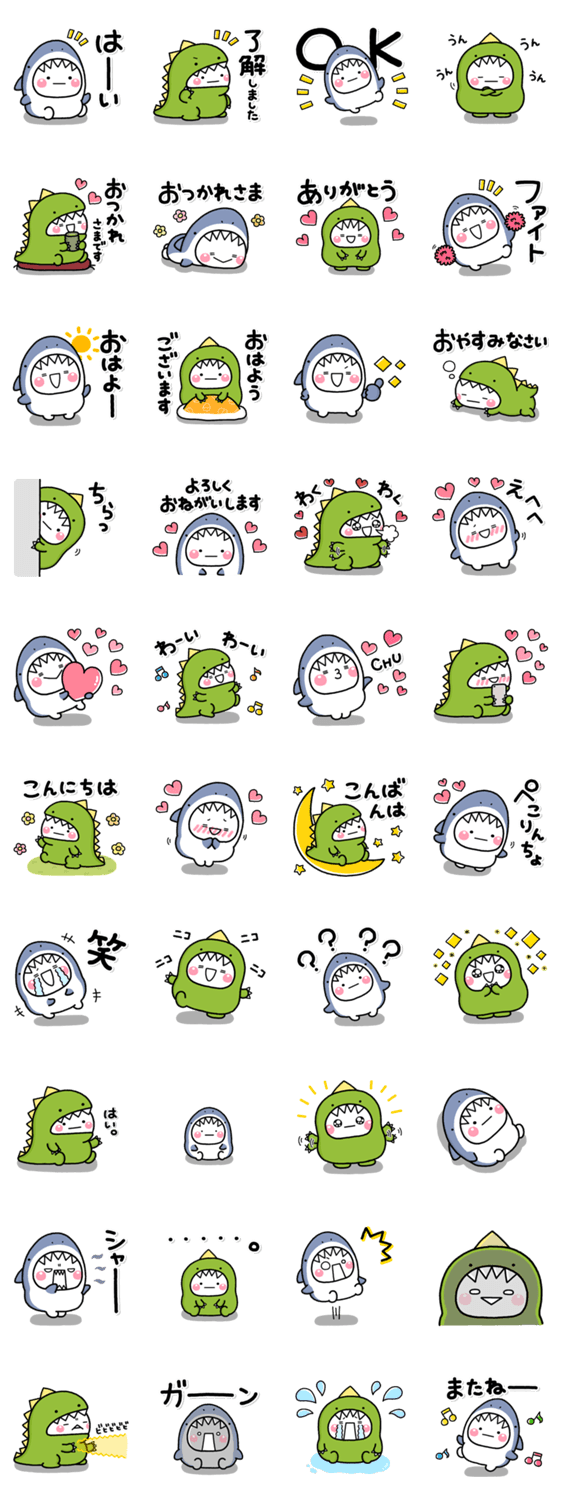 恐竜とサメの着ぐるみを着たしろまるの、怖い(?)スタンプです。【作:いしいともこ】