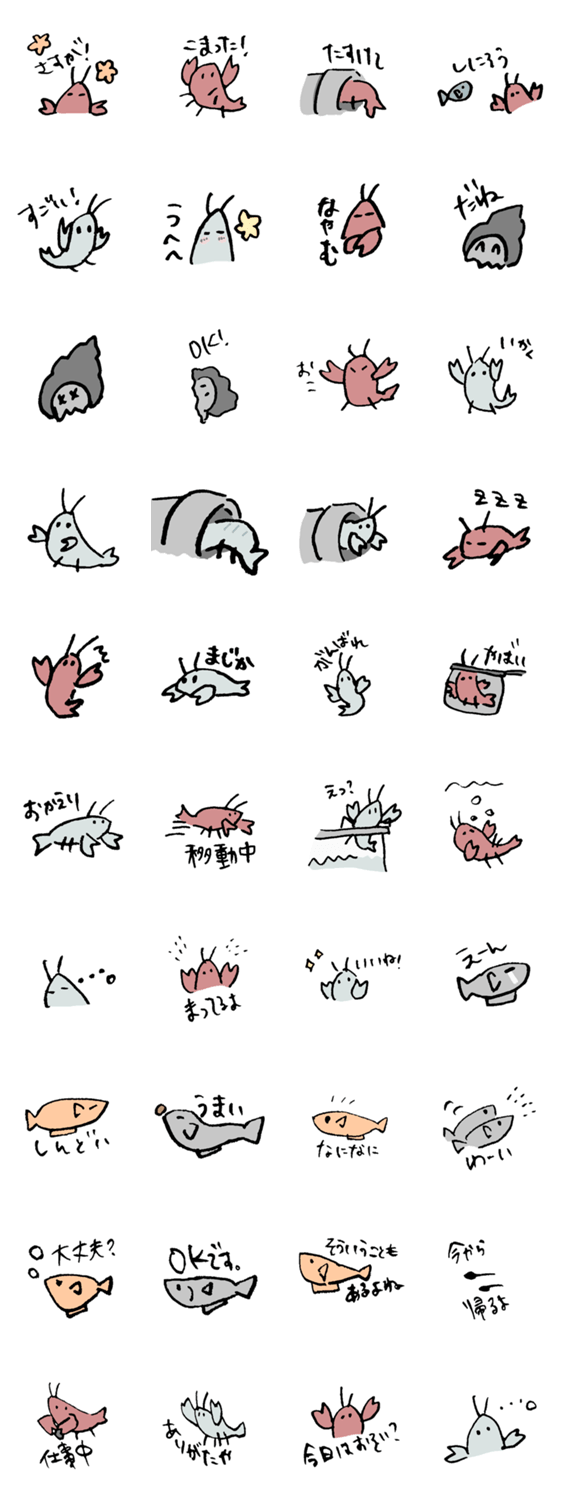 ザリガニと水槽の仲間たちをスタンプにしました。