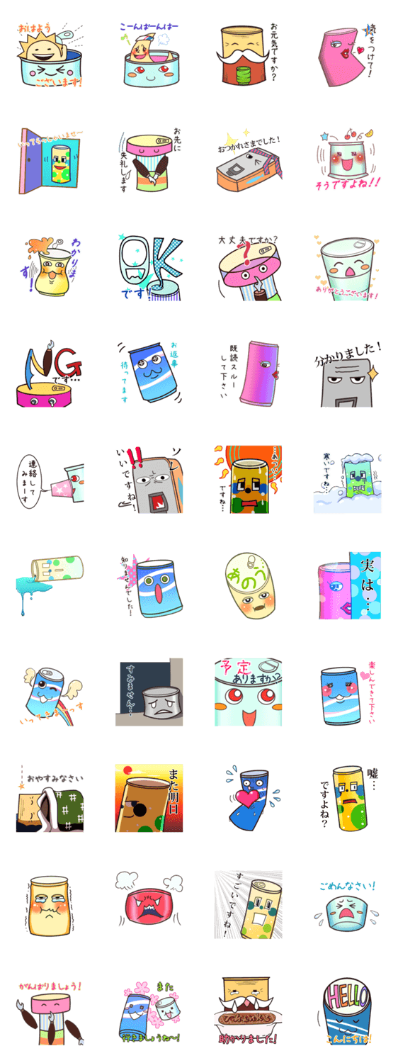 普段は無口な缶たちが、エモーショナル且つですます口調でさらっと気持ちを伝えてくれます。気軽に基本的なことを伝えたい場合にぜひお使い下さい。