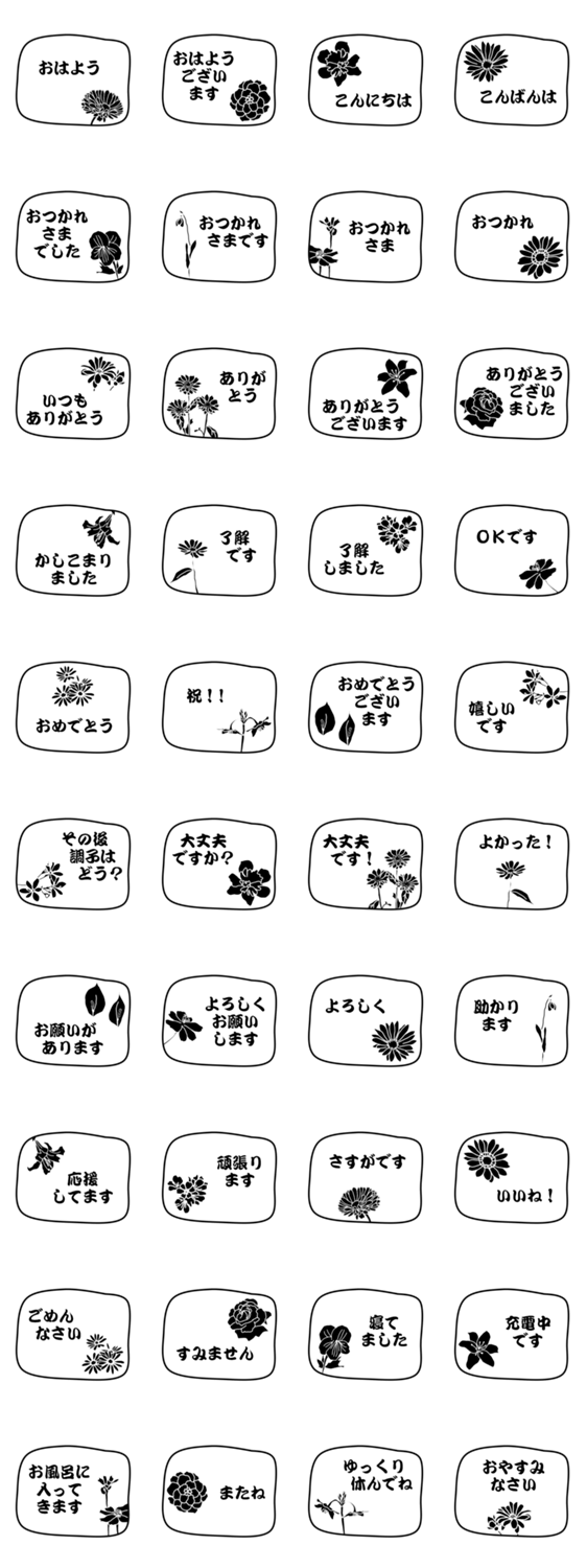 『日常会話』にモノトーンの花を添えて。 シンプルで使いやすいスタンプです。