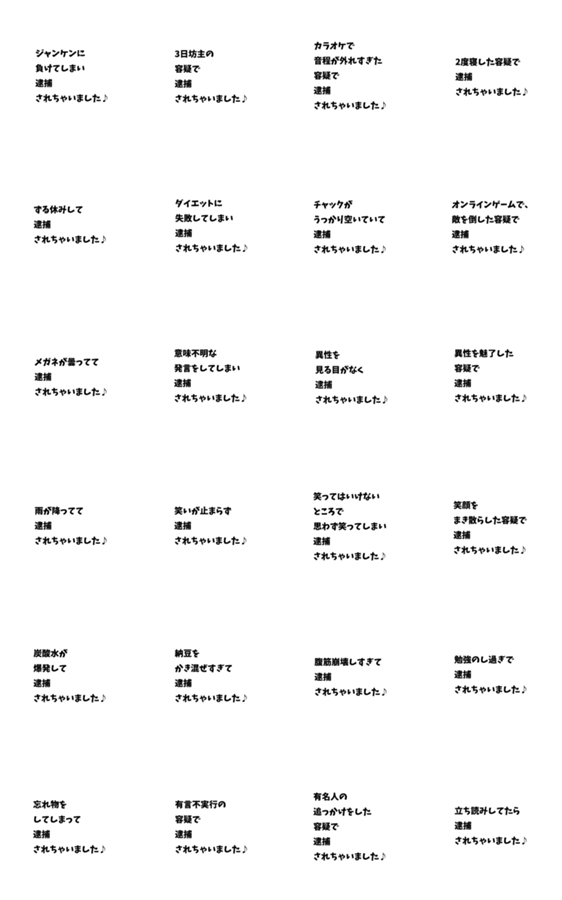逮捕されちゃいましたスタンプです。前作の「逮捕されました」スタンプと一緒にどうぞ。 ※決して作者が逮捕されたわけではありません。