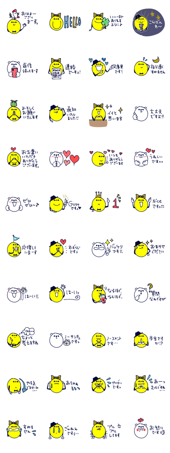 イェローなヒトたちが丁寧に伝えます。ベーシックなのでいろんなシーンで使える便利なスタンプです。シロクマさんもちょっと参加です♪