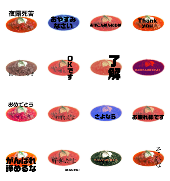 みんな大好き「ロシア料理 ボルシチ」の実写スタンプです。腹ぺこ、食いしん坊な友達にこのスタンプを送ろう!