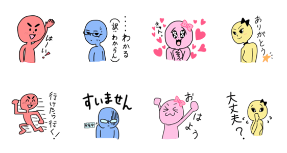 赤青桃黄の個性豊かなキャラクター達のスタンプです。