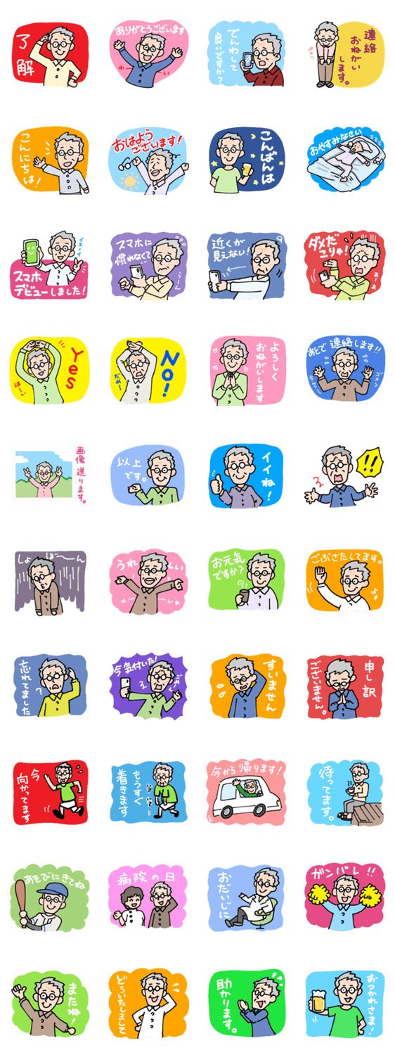 メガネをかけたおじいちゃんが日常で使える、大き目文字のスタンプです。まだスマホやLINEになれないシルバー世代の方へ、じいじ・祖父へのプレゼントにいかがですか?