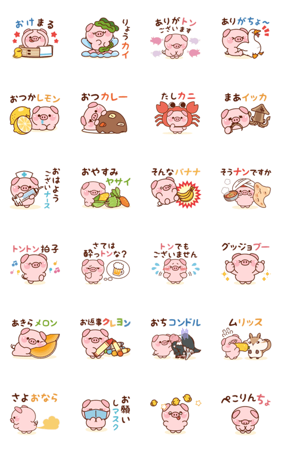 ダジャレが大好きな豚の「トン吉」の動くスタンプです♪定番のダジャレから日常使いできるものまで、色々揃っています!