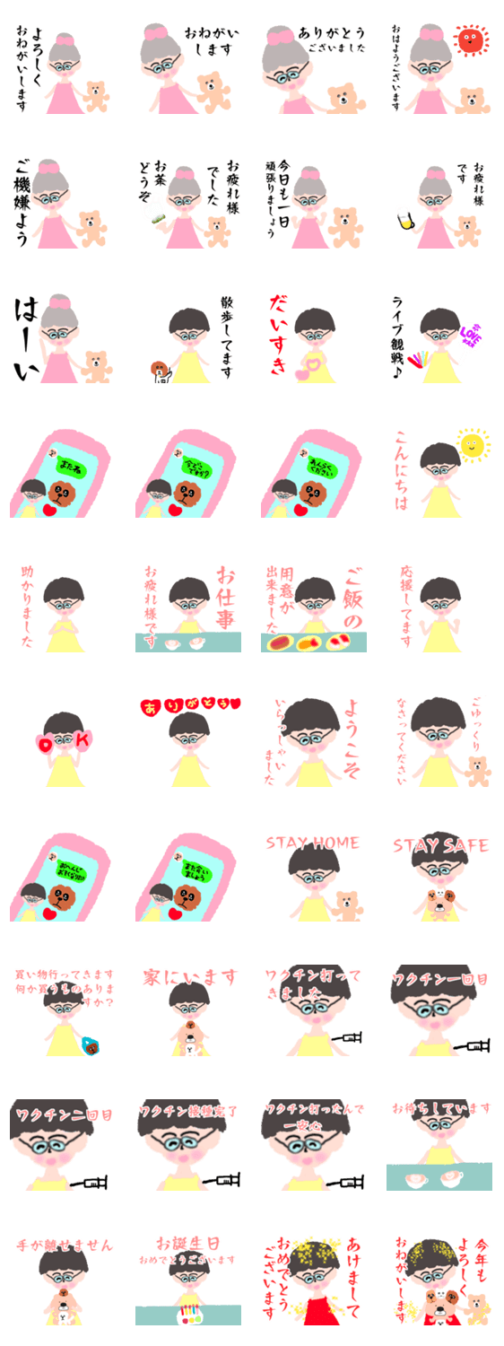 ベビーフェイスのシニアおばあちゃんの敬語•丁寧語スタンプ。/シニア/おばあちゃん/中高年/敬語/丁寧語/新年/正月/クマさん/犬/イヌ/猫/ネコ/大人女子/ワクチン/コロナ