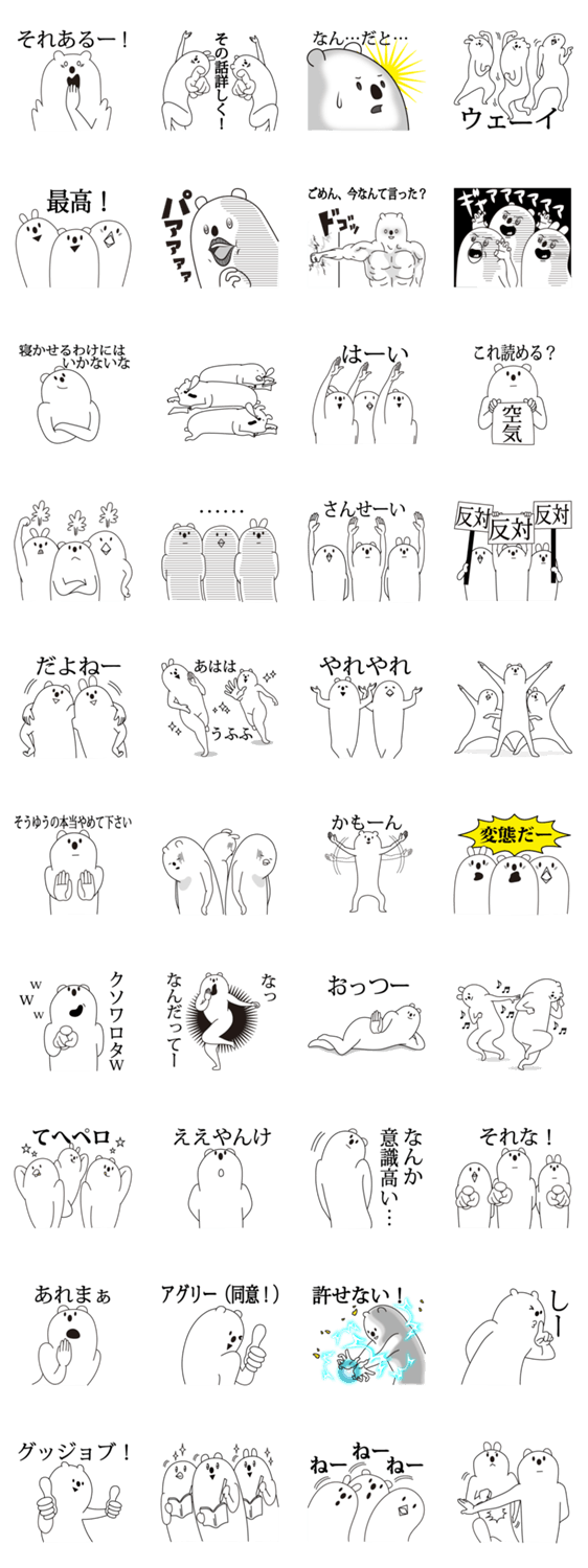うざい動物ことうざいアニマルシリーズ。意識高い系やうざ顔対応出来るスタンプあり。白いトリとうざいうさぎのうさまるも登場。真顔で追いつめるポップで可愛いうざいくま