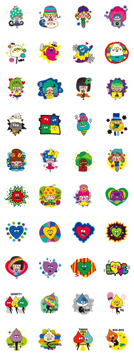 カラフルに喜怒哀楽。楽しく愉快になれるスタンプ。基本的にイラストだけなので自由に、センス良く使ってね。